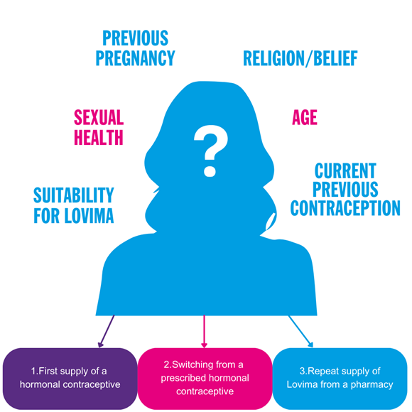 You will encounter many different scenarios concerning women visiting the pharmacy to ask about contraception and specifically Lovima. In all scenarios, you will need to check that the woman is (still) suitable for supply and that this is the right contraceptive option for her. Information on when to supply and how to take Lovima in different scenarios is provided in this chapter. Depending on the woman's scenarios, there may be additional areas to consider. You should investigate these areas to ensure you provide the women with the most appropriate advice.
