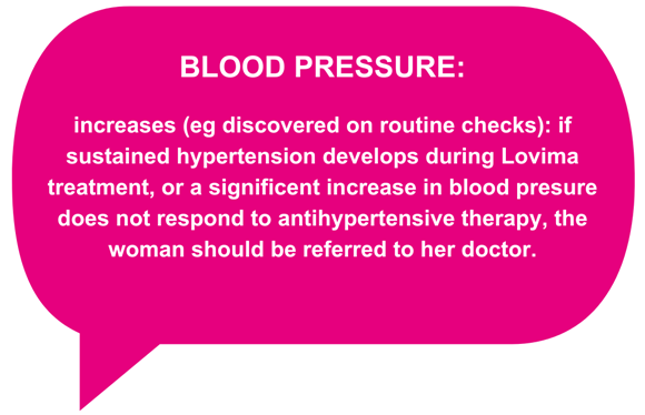 Take the opportunity during the check-ups at resupply to check if any of the conditions listed in the 'possible side effects' section have occurred while taking Lovima, and particular conditions that require immediate medical attention, such as VTE, liver problems and ectopic pregnancy (see the section on 'possible side effects'). The woman can find information in the PIL about health changes to which she needs to alert her doctor or pharmacist.