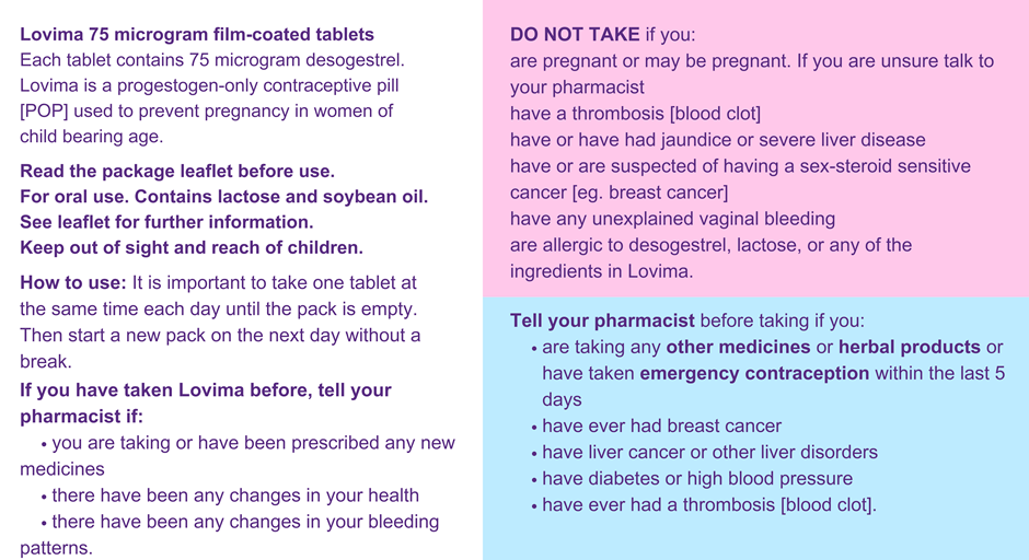 The following sections describe the contraindications and warnings in more detail, when you should refer the patient to a doctor, and how to manage potential interactions with other drugs. More detailed information can be found in the Lovima SmPC.